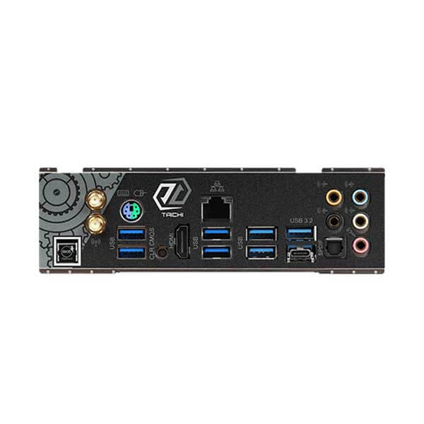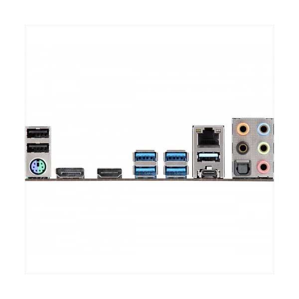 – 2 x Antenna Ports (on I/O Panel Shield) – 1 x PS/2 Mouse/Keyboard Port – 1 x HDMI Port – 1 x Optical SPDIF Out Port – 1 x USB 3.2 Gen2 Type-A Port (10 Gb/s) (Supports ESD Protection) – 1 x USB 3.2 Gen2 Type-C Port (10 Gb/s) (Supports ESD Protection) – 2 x USB 3.2 Gen1 Ports (Supports ESD Protection) – 4 x USB 2.0 Ports (Supports ESD Protection)* – 1 x RJ-45 LAN Port with LED (ACT/LINK LED and SPEED LED) – HD Audio Jacks: Rear Speaker / Central / Bass / Line in / Front Speaker / Microphone (Gold Audio Jacks) *Ultra USB Power is supported on USB_34 ports. ACPI wake-up function is not supported on USB_34 ports. |